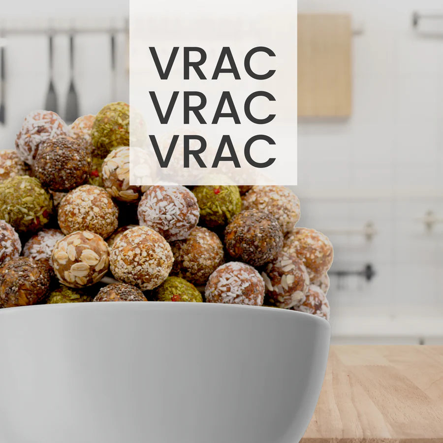 Afin de réduire au maximum nos emballage, nous proposons d'acheter nos energy-balls en vrac ! Nous utilisons pour cela des sachets compostables et les étiquettes collées sur nos sachets sont décollables facilement ! Tu peux donc les recoller facilement sur les bocaux dans lesquels tu mettras tes energy-balls ! En plus d'être plus écologique, le vrac est plus économique ;)